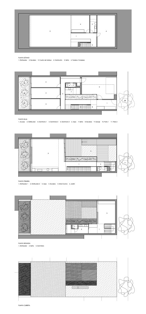 El deseo inicial del propietario era disponer de un jardín en cubierta para el disfrute familiar. En cambio, se optó por situar el deseado jardín como parte unitaria de la zona de día de la casa, ocupando el conjunto la totalidad de la planta primera, desde el patio abierto al fondo de la parcela, hasta la calle de acceso, a la que se asoma y mira.