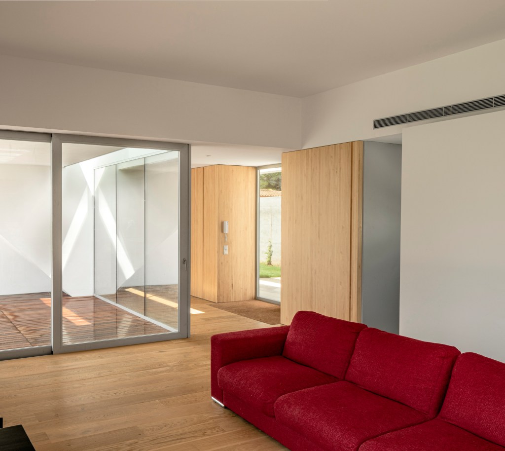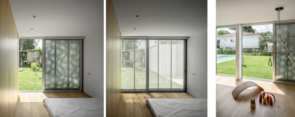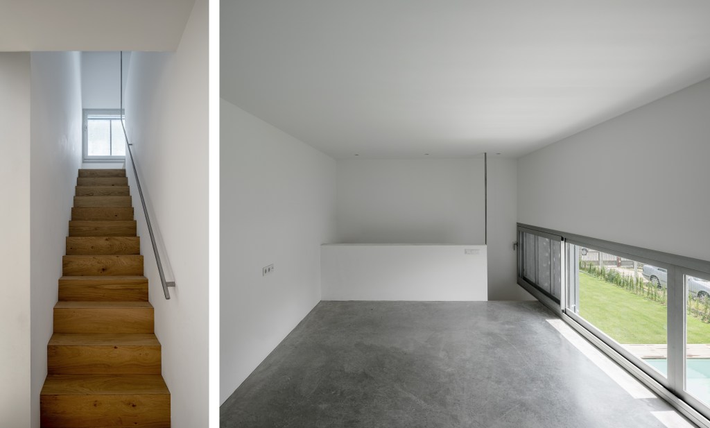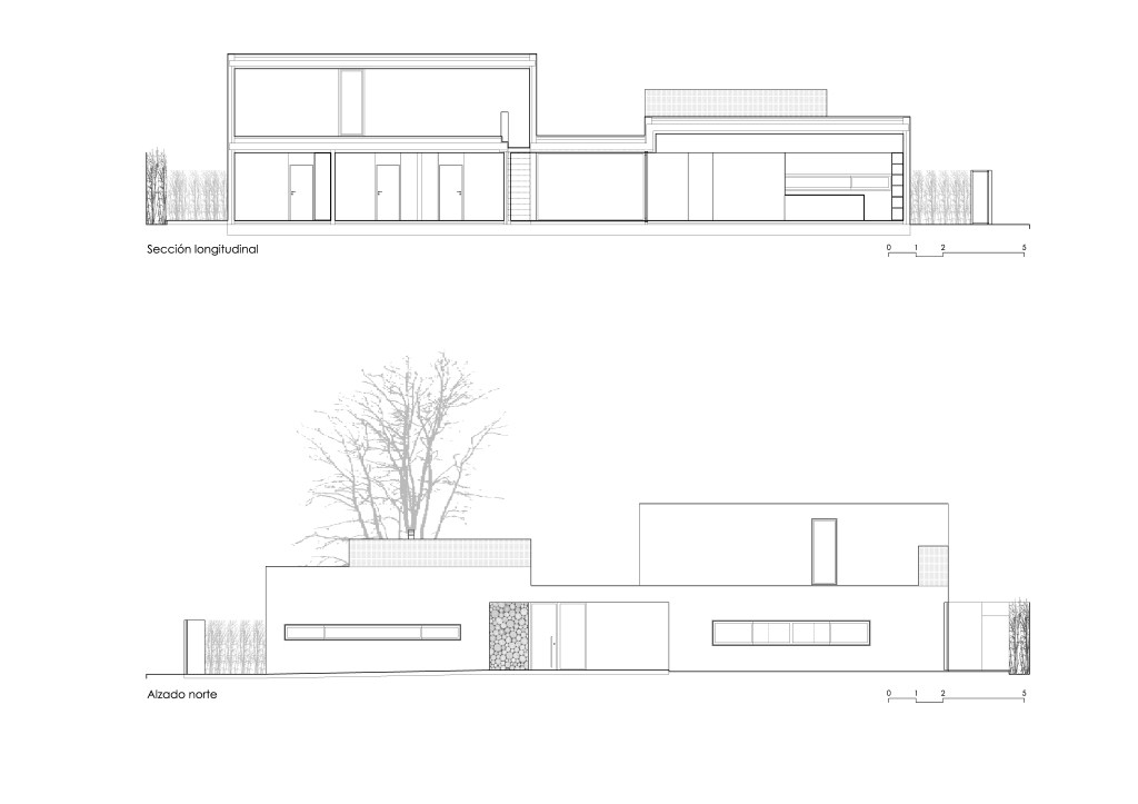 Los dormitorios y la sala de estar abren sus fachadas hacia el gran jardín, en cambio, la estrecha franja norte, reservada para servicios, lavadero y cocina, disfrutan del exterior mediante la apertura de largos huecos horizontales. En planta primera se emplaza un espacio polivalente diáfano donde se prevé la compartimentación para un futuro dormitorio y un baño. Esta última planta disfrutará del exterior a través de un gran hueco horizontal, que, situado a nivel de suelo, acentúa la relación con el jardín.