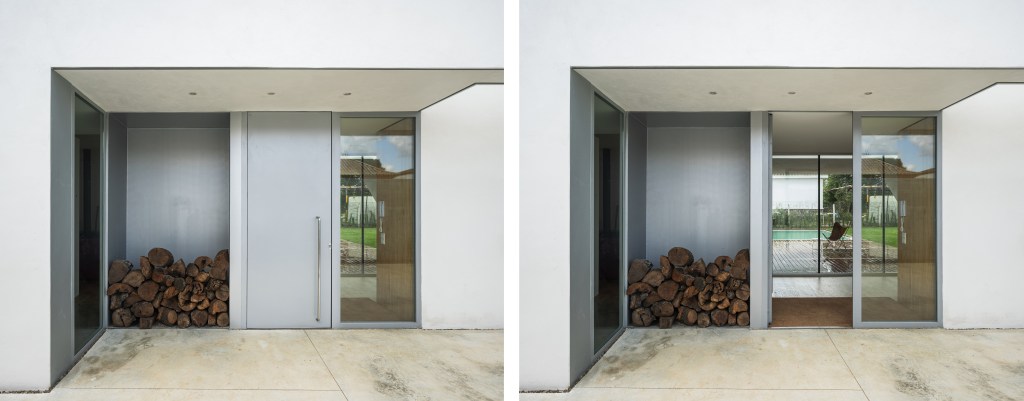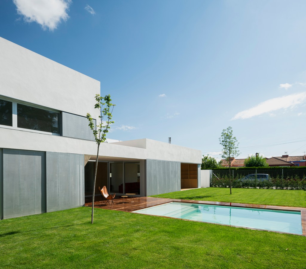 Apoyado al norte, se proyecta un volumen alargado, de borde a borde de la parcela, que libera, en el sur, una amplia zona para jardín. Una terraza, acomodada en el centro de este gran espacio libre, se extiende y penetra en el interior, formaliza el vestíbulo, y reverbera finalmente en la fachada norte, donde se sitúa el acceso principal de la vivienda. Esta terraza, sobre la que se recorta la piscina, actúa como verdadero corazón de la casa, introduce el jardín en el interior como otra habitación más de la vivienda, es esencial para la estructura funcional de ésta, y estructura también el jardín, al que dota de escala.