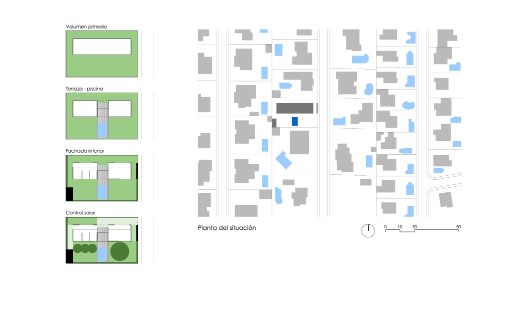 Al carecer de otras referencias más que la geometría rectangular y alargada de la parcela, el lugar se ocupa protegiéndonos del contexto que la rodea y atendiendo, estrictamente, a las condiciones programáticas, al recorrido del sol y a la normativa urbanística.