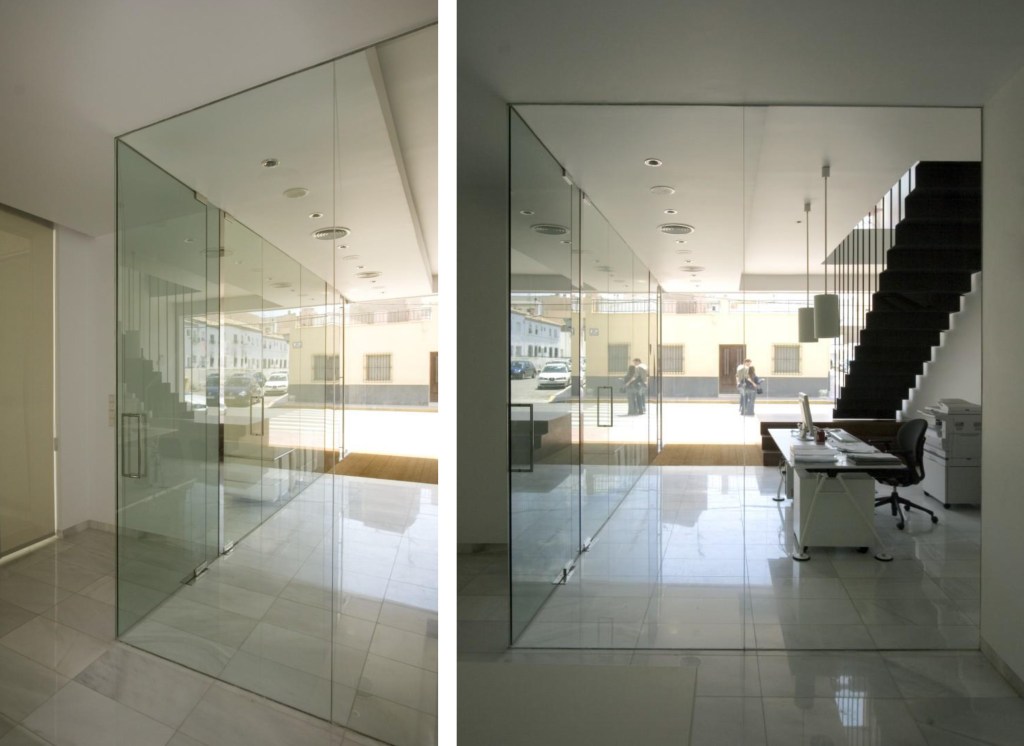 En torno a este espacio que fluye se disponen las estancias que acogen funciones mas concretas y definidas aunque susceptibles siempre de cambiar el uso. Estas estancias se separan entre sí mediante particiones opacas -cartón-yeso- y se abren transparentes -con o sin cerramientos de vidrio- hacia las diferentes zonas de trabajo y espacios generales de circulación.
