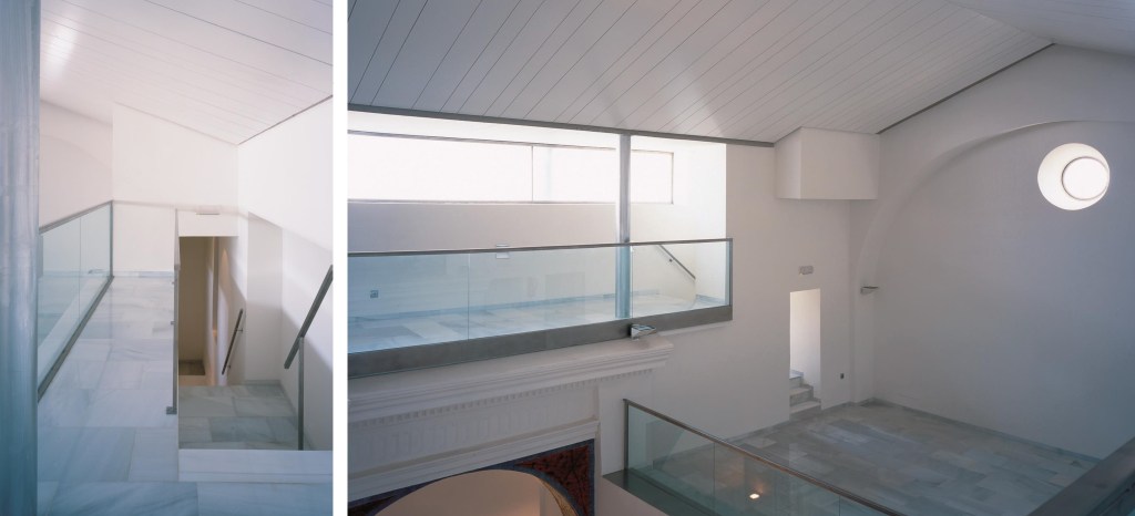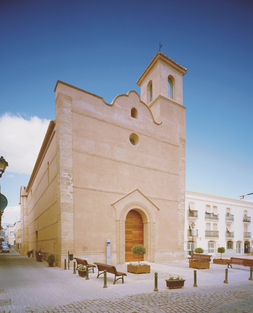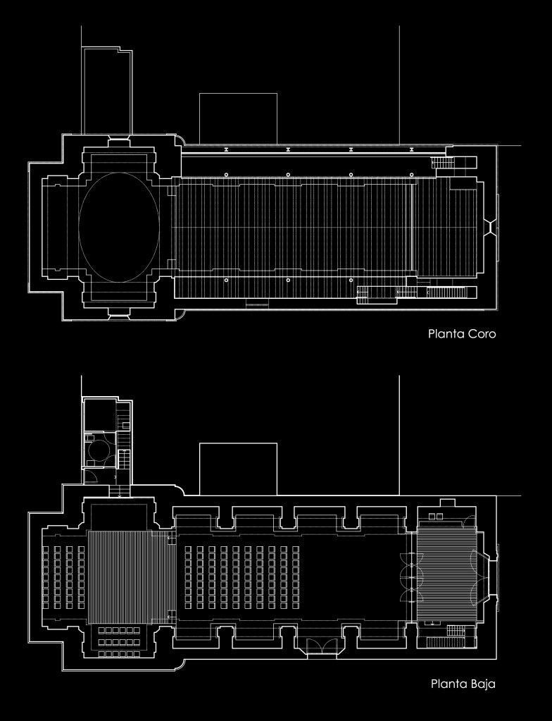 Partiendo del deseo del Ayuntamiento de recuperar el coro y conservar la torre en su estado original, se propuso intervenir de forma diferente. A nivel de suelo, se ha intervenido construyendo un zócalo de mármol que al recorrer las capillas laterales funciona como banco corrido serpenteante, bajo el crucero formaliza la plataforma sobre la que reposa la alfombra de madera que define el escenario, y bajo el coro, otra plataforma sobre la que apoya la escalera. A nivel de cubierta, además del nuevo techo, se ha ejecutado un lucernario que con su luz baña el nuevo espacio. En el nivel intermedio -bajo las cornisas existentes y sobre el nuevo zócalo- se realizan labores casi exclusivamente de conservación y restauración, se recuperan los valiosos paños de frescos aparecidos bajo capas de revestimientos preexistentes y también se recuperan otros frescos de menor valor que por razones sentimentales la propiedad ha deseado conservar.